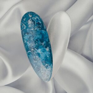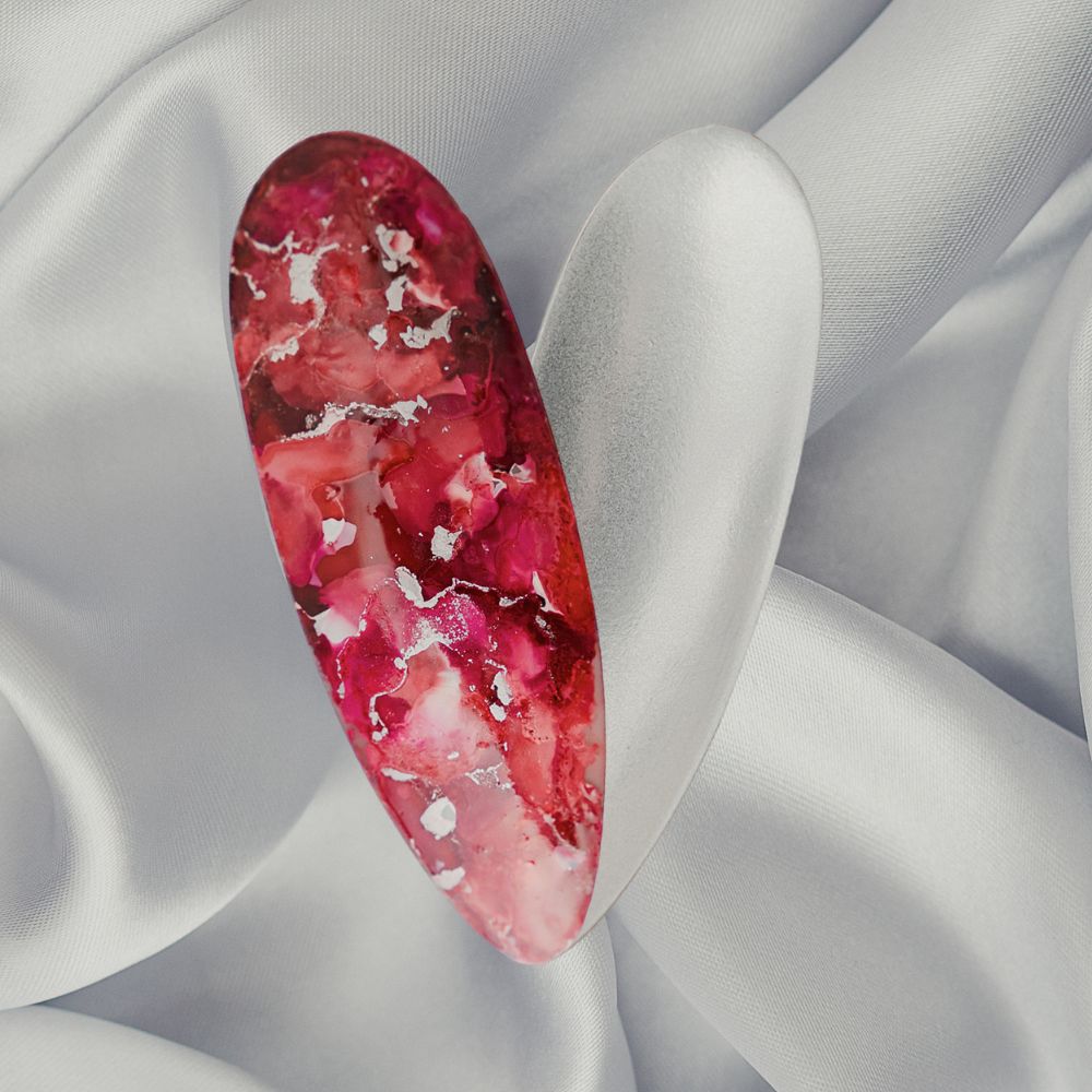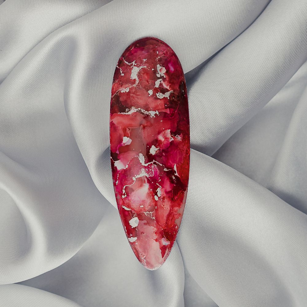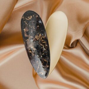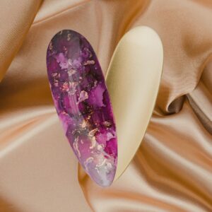 9,30 cm x 3,10 cm, espesor 1 mm. Material de acero inoxidable con diseño trasero hecho a mano, elaborado con pinturas con alcohol, purpurina y resina epoxi.